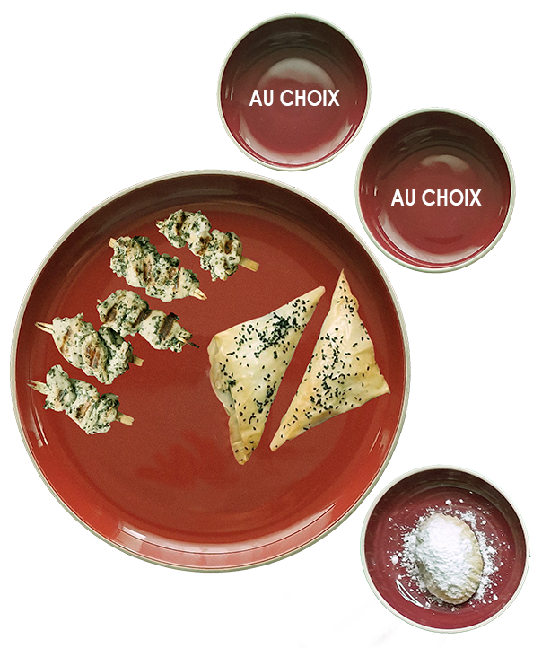 2 entrées* au choix ; poulet à la menthe séchée ; feuilleté à la fêta et graines de nigelle ; maamoul aux dattes.