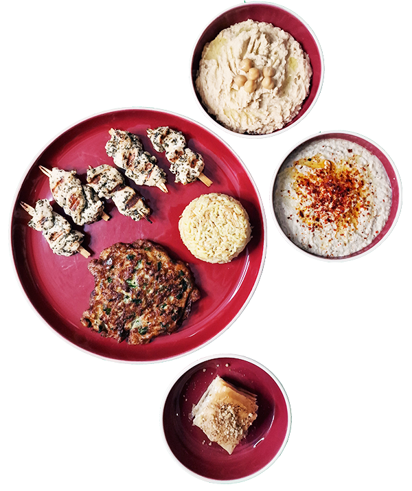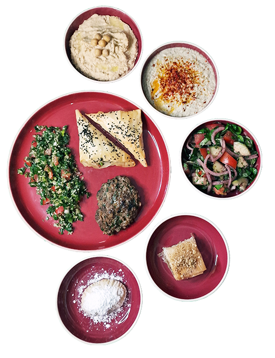 Houmous ; caviar d’aubergine ; salade fattouch ; pièce de bœuf kefté ; feuilleté à la fêta et graines de nigelle ; taboulé libanais ; paklava de noix et pistache ; maamoul aux dattes.