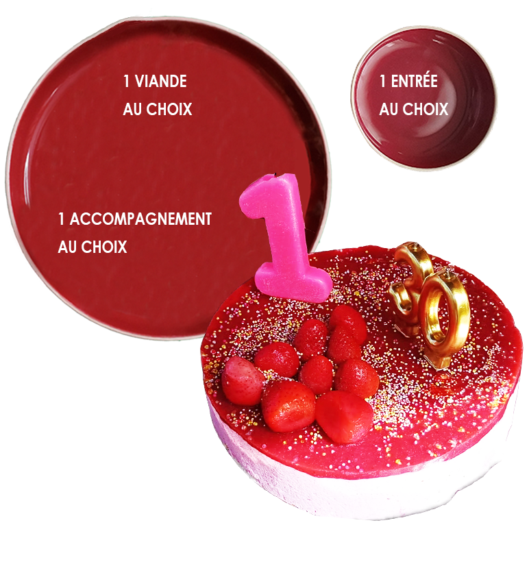 1 entrée* au choix, 1 viande* au choix, 1 accompagnement* au choix, 1 gâteau grande taille sur mesure.