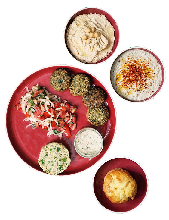 Houmous ; caviar d’aubergine ; falafels et leur sauce talatoul ; salade de tomates ; lentilles corail et oignons frits ; gâteau à l’orange. Repas 100 % végan